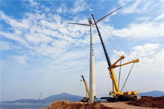 作为亚洲装机量最大的风电地区之一,近年来,广东已建和在建大型风电场超过80个。广东湛江徐闻县,位于中国大陆最南端,广东省西南部,在长达378公里连绵的海岸线上,自北向东、西、南三面倾斜,三面环海,这里丘陵纵横,海拔在100—240米的山岭近20座,是风力发电的黄金地带。50台套的风机即将在2个月内被安装到位,产生的134万千瓦发电量,将造福东南沿海三个省份。这个总投资79亿元的风电安装项目,吸引了十余家安装公司的竞标,世界顶级的吊装设备均在这里角逐。吊装设备的转场效率和吊装性能,将成为能胜出的关键,我国自主研发的QAY1200和QAY650全地面起重机成为最大的赢家。它们曾连续20天在零下35度的内蒙古安装风机,更是创造在各种复杂山地中完成31个风场,近400台风机安装的纪录,让号称世界最高水平的欧美吊装设备也望而却步。因为,在全世界吊装案例中都不曾经历的带载230吨的重载行驶技术,只有中国企业——徐工集团掌握。