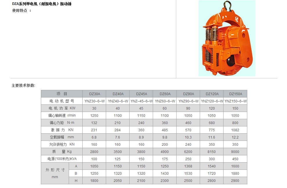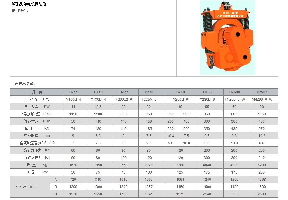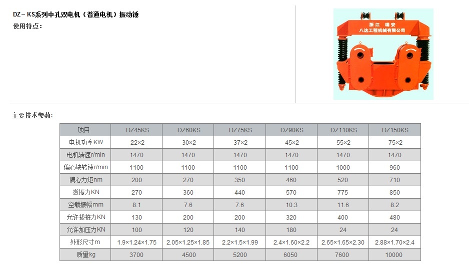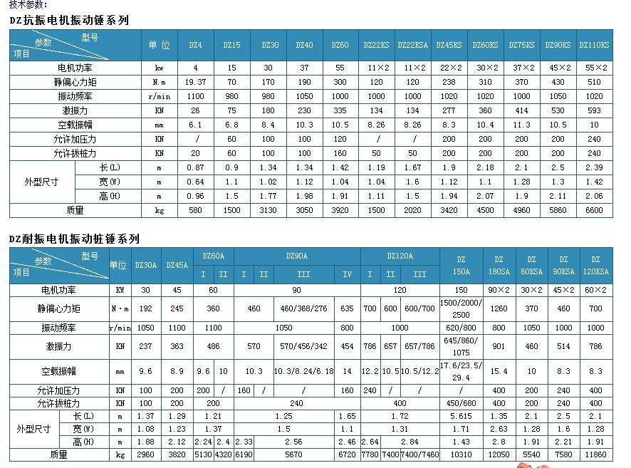包含DZ45,DZ60,DZ90,DZ120,DZ150,DZ220型振动锤性能表。
